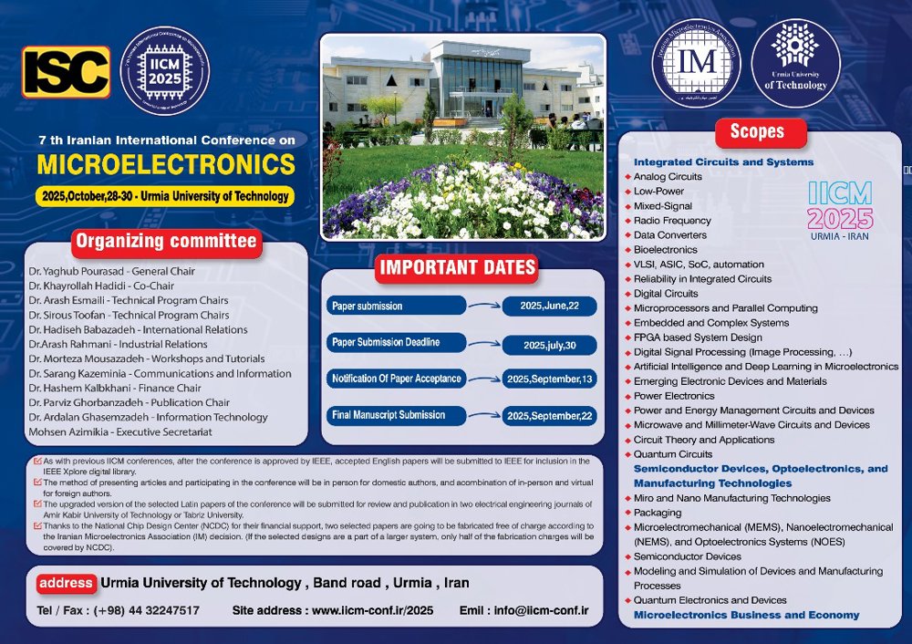 Urmia University of Technology is proud to hold the 7th Iranian International Conference on Microelectronics with the participation of Iranian elites inside and outside the country and with the support of the Best universities on October 28 to 30 2025 in Urmia.